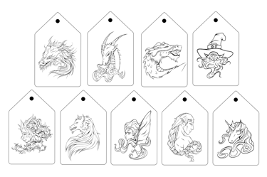 des créatures fantastiques, dessinées en digital puis gravées sur bois pour un rendu artisanal et texturé,