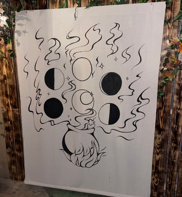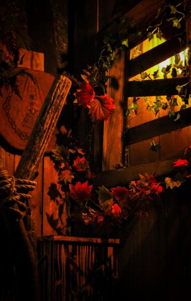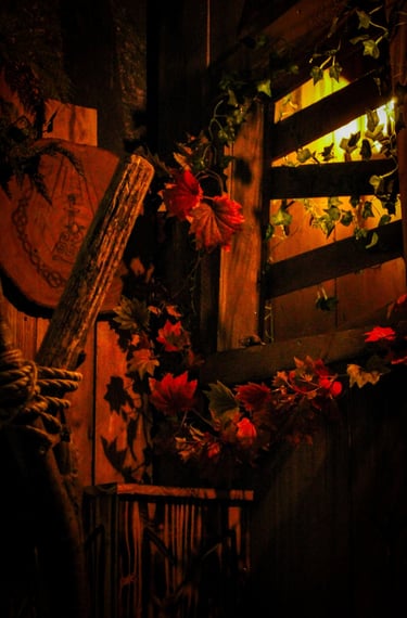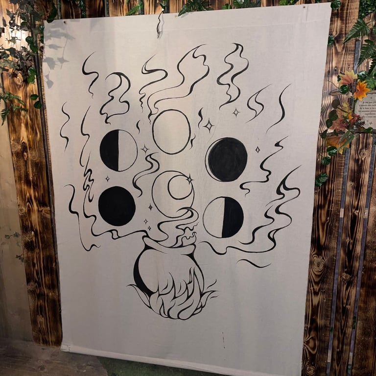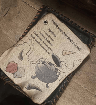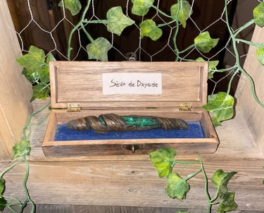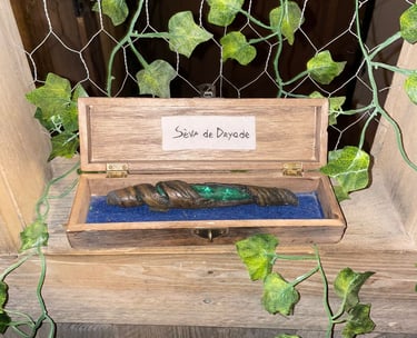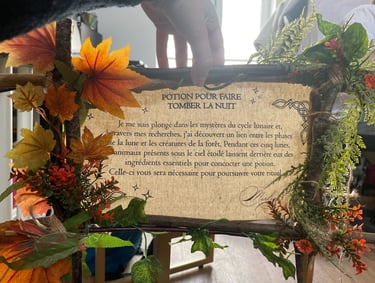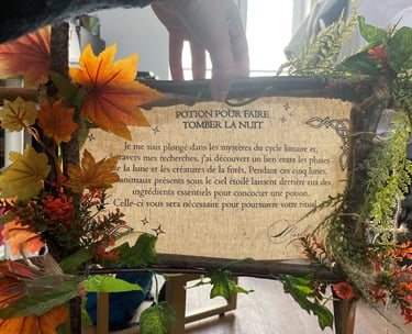 J’ai réalisé des décors fleuris et organiques, la peinture à la main d’un blason médiéval, ainsi que la création d’éléments artisanaux tels que des potions, écriteaux, plantes et objets narratifs destinés à être mis en valeur.