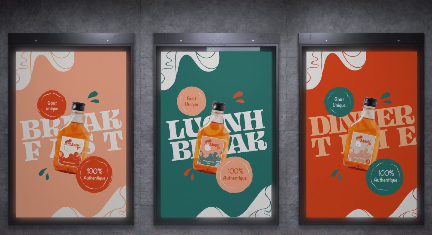 J'ai choisi de réaliser trois affiches relativement similaires afin de créer une campagne de communication. Elles montrent que le sirop d’érable peut être consommé à n’importe quel moment de la journée. Les couleurs sont dynamiques et attirent l’œil.